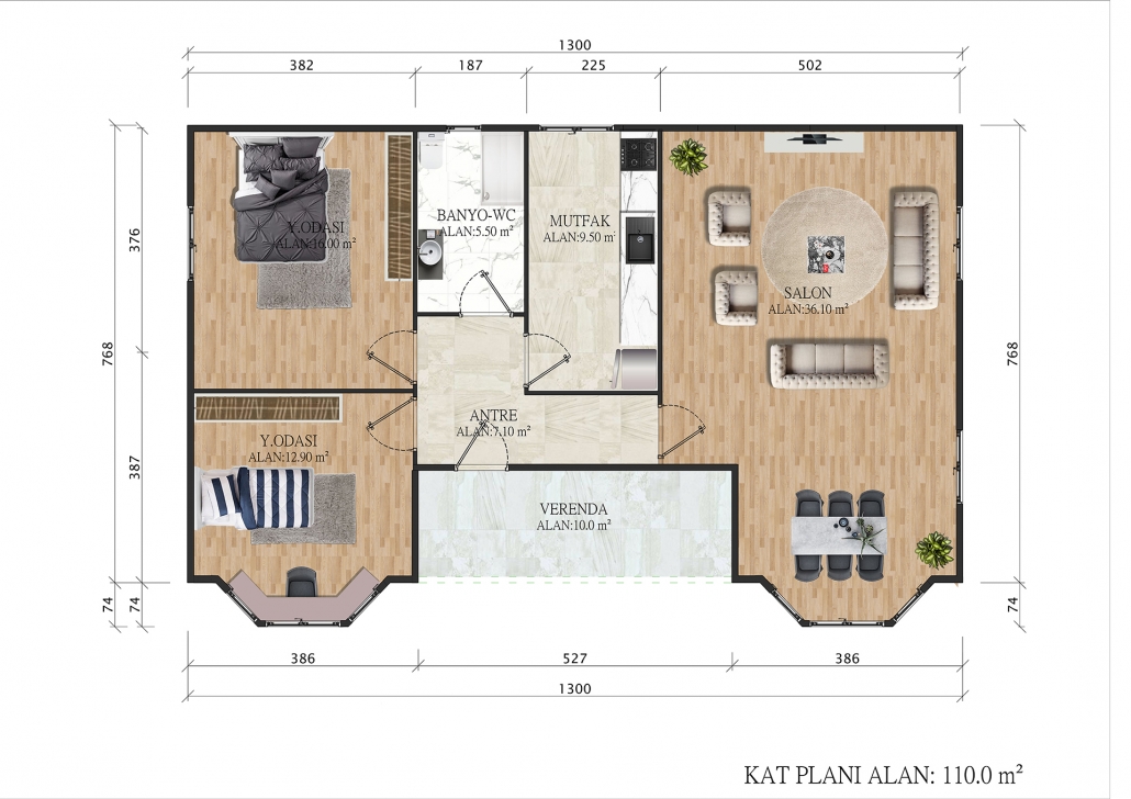 Hızlı montaj süreci ve düşük bakım maliyeti ile 110 m² Tek Katlı Prefabrik Ev, yazlık, daimi konut veya misafir evi olarak rahatlıkla tercih edilir. İç ve dış tasarım, müşterinin ihtiyaç ve zevkine göre özelleştirilebilir.