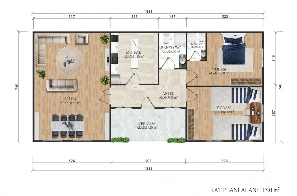 Hızlı montaj süreci, düşük bakım maliyeti ve ekonomik fiyatıyla 115 m² Tek Katlı Prefabrik Ev, yazlık, daimi konut veya misafir evi olarak rahatlıkla tercih edilir. İç ve dış tasarım, müşterinin ihtiyaçlarına ve zevkine göre özelleştirilebilir.
