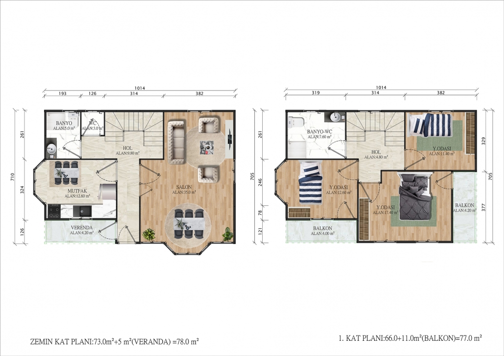 Pramo Prefabrik Yapı Teknolojileri tarafından tasarlanan 155 m² Çift Katlı Prefabrik Ev, ferah iç hacmi, fonksiyonel yerleşim planı ve modern mimarisiyle üst düzey yaşam standardı sunmak için geliştirilmiştir. Alt katta yer alan geniş salon, ayrı mutfak, misafir odası ve banyo; aile içi sosyal etkileşimlere alan tanırken, üst kattaki ebeveyn yatak odası, çocuk odaları, banyo ve çalışma alanı ise mahremiyet ve rahatlığı bir arada sunar.