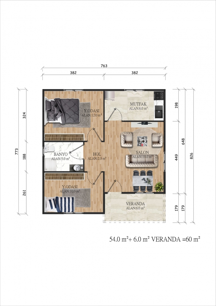 Hızlı montaj avantajı, düşük bakım maliyeti ve ekonomik fiyatıyla 60 m² Tek Katlı Prefabrik Ev, yazlık, misafir evi veya daimi konut ihtiyacına uygun pratik bir çözümdür. İç ve dış tasarım seçenekleri müşterinin ihtiyaçlarına göre özelleştirilebilir.