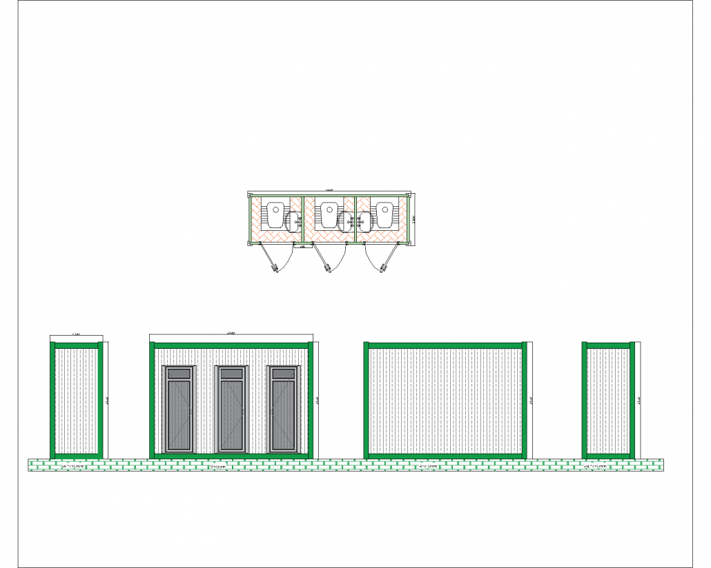 Ön cephede, her bölümde ayrı camlı kapılar bulunmaktadır ve kapıların üst kısımlarında havalandırmayı destekleyen küçük pencereler yer almaktadır. Sağ, sol ve arka cephelerin kapalı olması, mahremiyeti artırırken kabinin dayanıklılığını da destekler. Hafif çelik çerçeve ile inşa edilen kabin, dış etkenlere karşı dayanıklı ve uzun ömürlüdür. Bu çok amaçlı tuvalet kabini, şantiye alanları, büyük etkinlikler veya toplu kullanım gerektiren yerler için ideal bir yapı sunar.