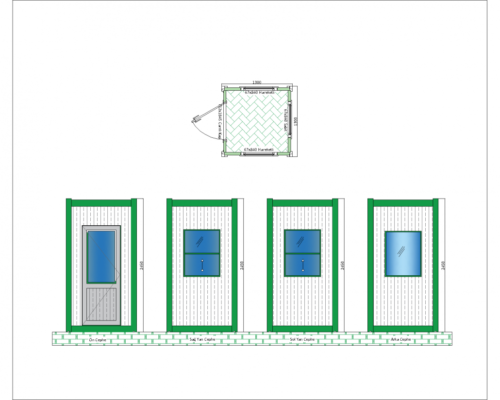 Kabin, ön cephede yer alan 924×1954 mm boyutlarında camlı bir kapıya sahiptir. Bu kapı, kabine kolay giriş imkanı sunarken, üst kısmında bulunan küçük penceresi ile havalandırmayı destekler. Sağ ve sol yan cephelerde 676×840 mm boyutunda açılabilir pencereler yer almakta olup, bu sayede iç mekanda ferahlık ve doğal ışık sağlanır. Arka cephede ise sabit bir pencere bulunur, bu da ek ışık girişi sağlayarak iç mekanın daha aydınlık olmasına katkıda bulunur.